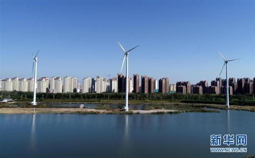 矗立在中新天津生态城河边的风力发电车(10月8日无人机拍摄)。新华社记者岳月伟摄
