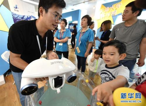深之蓝水下新视界公司员工(左一)在天津举行的全国科普日活动上向小朋友介绍水下平衡车(9月15日摄)。新华社记者岳月伟摄