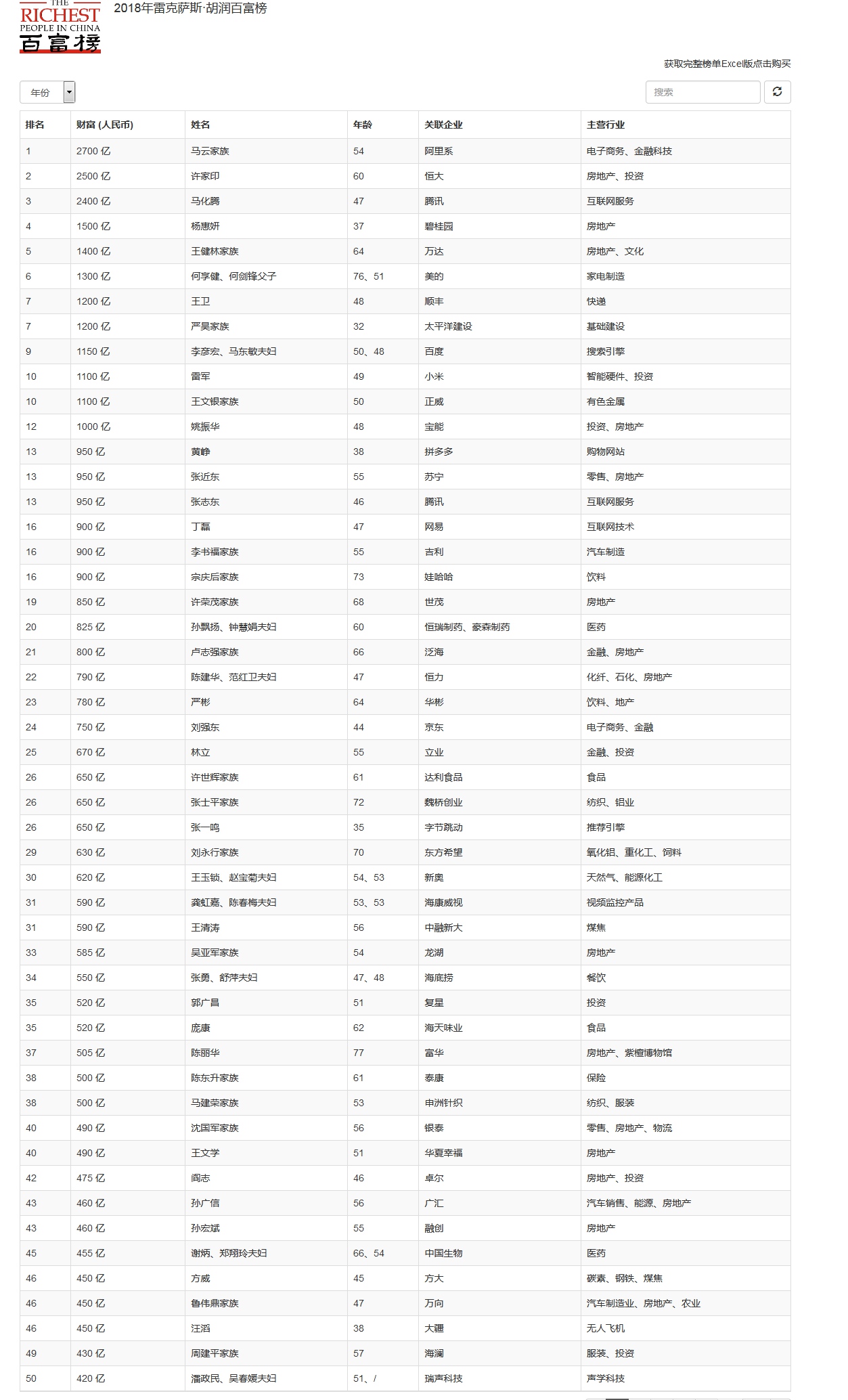 胡润百富榜前50名单 来源:胡润百富网