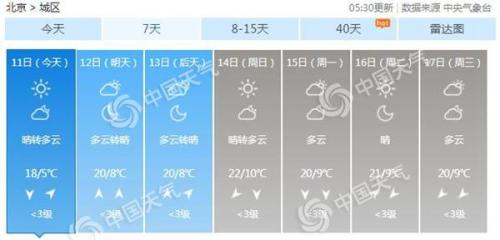 未来几天北京仍在回暖当中,明后天都是多云转晴的天气,最高气温20℃,最低气温8℃。到了周日,最高气温将回升至22℃,最低气温也回到10℃上下。