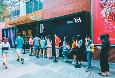 7月26日-8月26日,《鞋履:乐与苦展览》在北京三里屯太古里北区红馆展出。图为游客在参观展览。(图片来源:人民网)