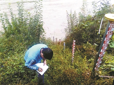 工作人员在丽江境内的金沙江边进行测量