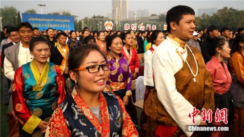 西藏民族大学是一所具有西藏地方特色的民族高校,图为10月15日,西藏藏族学生穿着藏装参加校庆活动。江飞波 摄