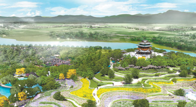10月11日,记者在现场看到,园区最高的建筑——天田山顶的永宁阁已经揭开了面纱,这是一处典型的中国传统风格宫苑建筑,采用“高台阁院”式布局,整体意象可以概括为:花田错落,重台参差,回廊环绕,高阁耸峙。