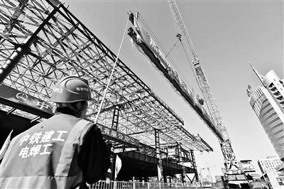 清河火车站主站房,最后一榀钢梁被放置在了主站房东侧顶端的缺口处 摄影/本报记者 袁艺