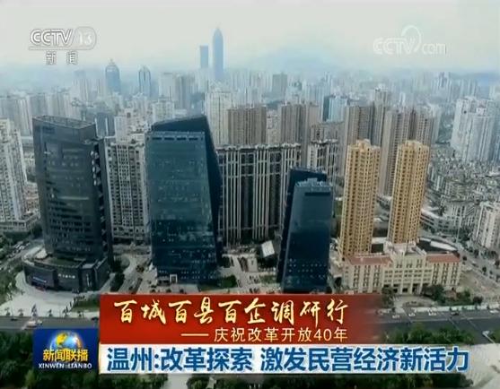 央视网消息(新闻联播):接下来是《百城百县百企调研行——庆祝改革开放40年》系列报道。改革开放40年来,温州探索出了民营经济发展奇迹的“温州模式”。进入新时代,温州再次勇当改革“探路者”,正在通过创新发展模式、优化营商环境,激发民营经济新活力。