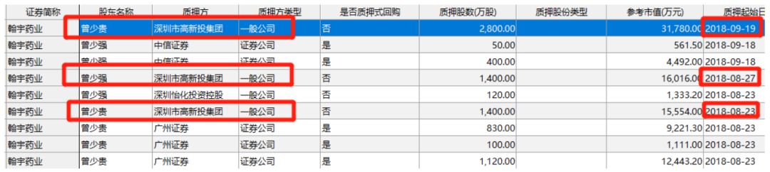 同样出现在和而泰身上。此次出面的是,深圳市高新投集团分三次,分别从8月23日、8月27日和9月19日,为股东曾少强办理了共计5600万元股份质押。