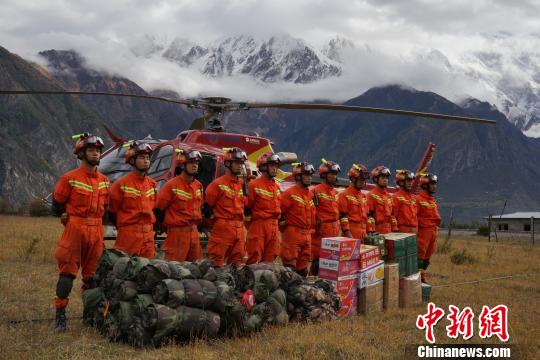 10月20日中午,西藏消防员搬运物资至直升飞机,这些物资将运至受灾的加拉村。 江飞波 摄