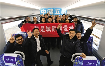 2017年1月1日,参与建设长株潭城际铁路的中国建筑第五工程局有限公司工作人员在列车上合影留念。记者 李尕 摄