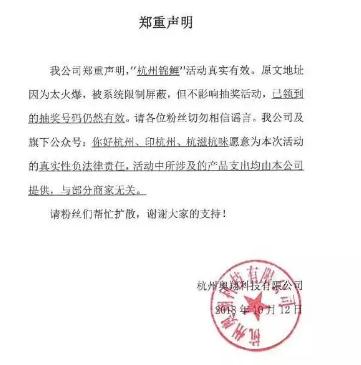微信上的“锦鲤”活动参与方式是点击公众号提供的链接,然后填写个人信息,如手机号码,身份信息等。而杭州锦鲤除了要求填写个人信息以外,还要求关注其他公众号。针对这些问题,商家作出声明。但目前,该篇推文因内容违规无法查看。
