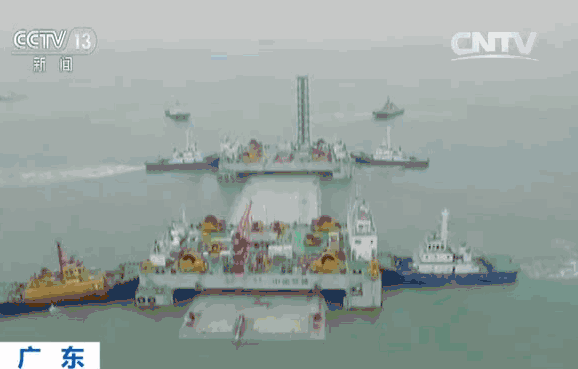 “振华30”起重船吊起海底隧道最后接头沉放进位于海底的E29和E30沉管之间。