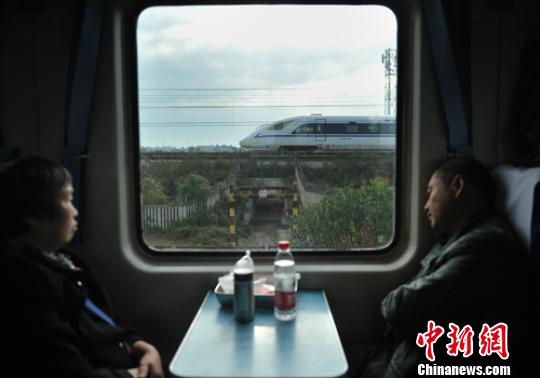 T8次“绿皮”列车车窗外一列高速列车正快速驶过。 刘忠俊 摄