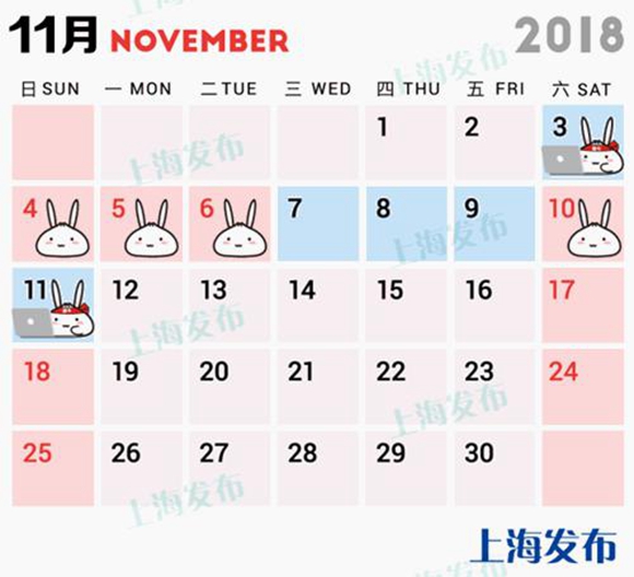 进口博览会期间,上海将调整公众休息日。11月5日(周一)调整为休息日,相应将11月3日(周六)调整为工作日;将11月6日(周二)调整为休息日,相应将11月11日(周日)调整为工作日。除保障进口博览会举办、重大活动、城市运转等必要的工作岗位外,本市机关、事业单位(包括学校)和社会团体按此执行。证券交易机构正常运行,不做调休。企业和其他单位可根据实际情况,自行安排。