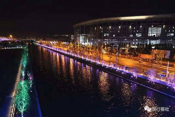 步行:九月底,连接虹桥商务区核心区与国家会展中心的二层步廊东延伸工程竣工。以后,大家可以从虹桥商务区,甚至是从虹桥火车站、虹桥机场出发,不用绕行,直接进入“四叶草”了!二层步廊东延伸段总长504米,通过二层步廊,从虹桥商务区核心区步行至国家会展中心约10分钟。二层步廊灯光效果集中体现了“七彩聚虹梦想筑桥”的主题,跨新角浦两岸廊道部分灯光和跨河桥梁灯光将融为一体,将向市民呈现一幅廊转灯回,虹卧绿波,飞鸟振翅的瑰丽光影。