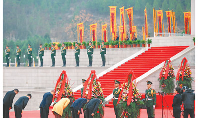 2016年4月,中国统促会组织台湾、澳门地区41名大学生赴陕西参访。图为学生代表向黄帝陵敬献花篮。(资料图片)