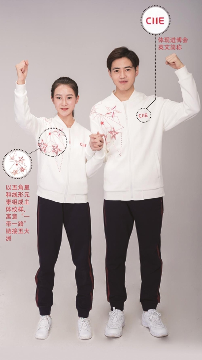 首届进博会志愿者服装共有两款。一款是新中式西装,灵感源于五星红旗,红色明快鲜亮,代表朝气、热情;白色宁静舒缓,代表和平、友善;灰色沉稳大气,代表时尚、专业。红白灰线面交织,领口呈现五星造型,点缀“四叶草”形纽扣,凸显海派的都市韵味;另一款是运动套装,以五角星和线形元素组成主体纹样,寓意“一带一路”链接五大洲,体现进口博览会是“一带一路”倡议的生动实践,描绘出进口博览会将促进全球贸易和世界经济增长,推动人类命运共同体建设的美好愿景。
