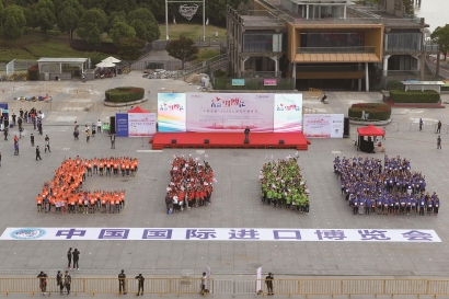 10月21日,“青春进博‘汇’”——太保安联2018上海青年风尚节在世博庆典广场启动。近千名参与者用不同颜色的服装,共同拼成“CIIE”字样,为“进博”出发、为“进博”喝彩。