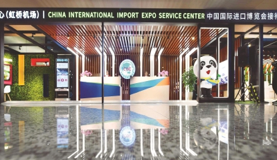 在浦东机场,为进口博览会设置的四个中国国际进口博览会接待服务中心日前“盛装”投用——不仅面积大于机场同类咨询柜台,而且均设置在航站楼中客流最密集的到达和出发区域;问询台配有文字版进口博览会资料简介,旁边的两个大屏幕不断循环播放进口博览会宣传片、吉祥物 “进宝”和上海城市宣传片等内容,引人注目。