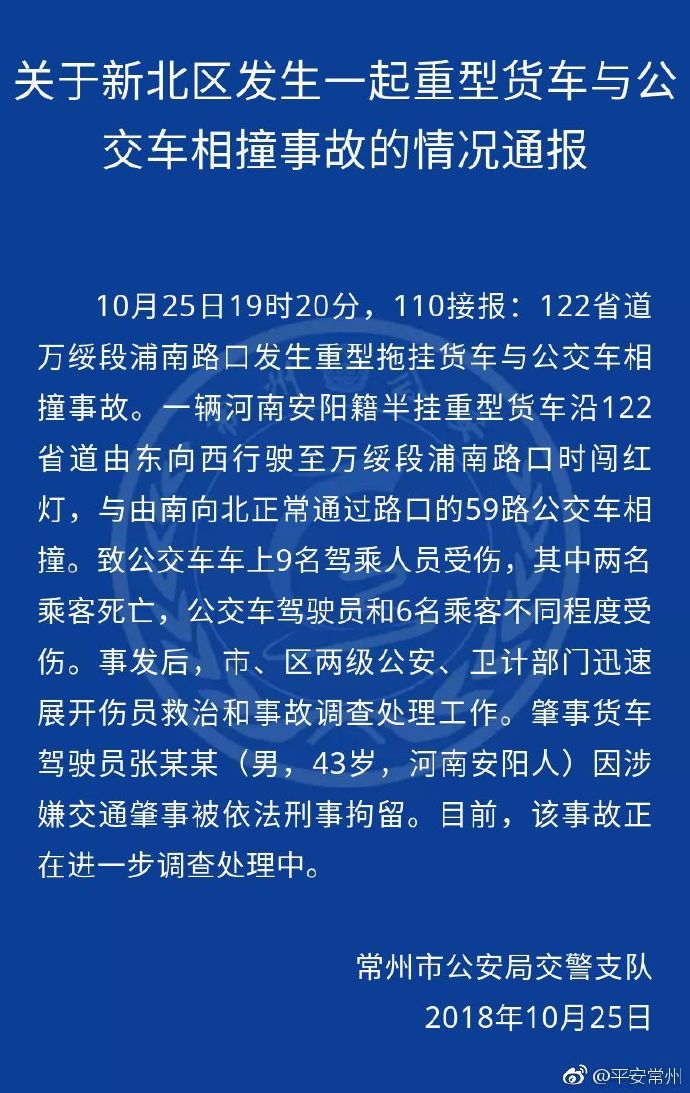 中新网10月26日电 常州市公安局官方微博25日晚发布通报称,当日19时20分,常州新北区发生一起重型货车闯红灯,与一辆公交车发生相撞事故,致2名乘客死亡,公交司机与6名乘客不同程度受伤,肇事货车驾驶员张某某(男,43岁,河南安阳人)因涉嫌交通肇事被依法刑事拘留。