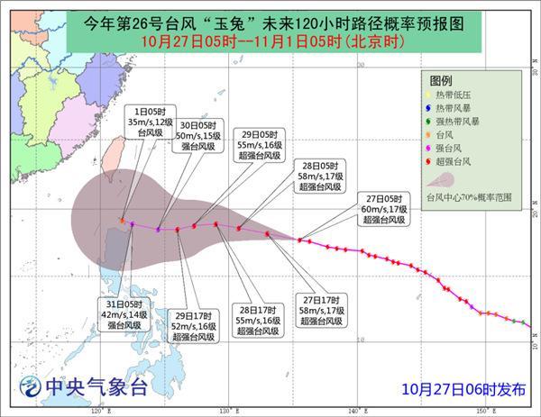中国天气网讯 今年第26号台风(超强台风级)“玉兔”的中心今天(27日)早晨5点钟位于菲律宾马尼拉偏东方向约1590公里的西北太平洋洋面上,就是北纬17.7度、东经135.5度,中心附近最大风力17级(60米/秒),中心最低气压920百帕,七级风圈半径380-400公里,十级风圈半径120-130公里,十二级风圈半径70公里。