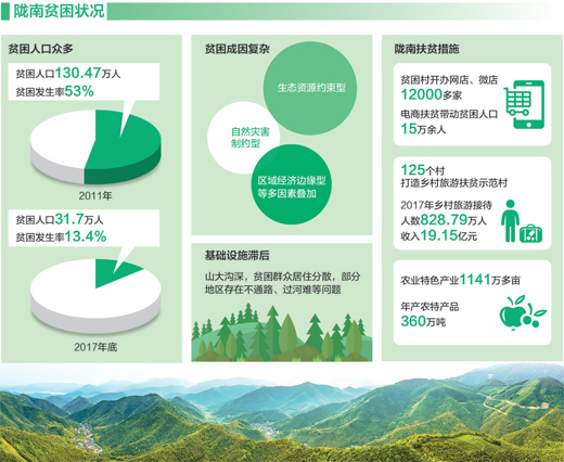 “没想到这里山大沟深,还藏着数万个网店”“来陇南旅游,印象最深的是一个个原生态的美丽乡村”……来到甘肃陇南脱贫攻坚一线,记者感受到这里在精准扶贫实践中探索出来的可贵经验。陇南曾经是甘肃省最贫困的地区之一,这些年励精图治,通过制度、政策创新,激活光热林地等资源,大山之中“长”出了脱贫产业,脱贫攻坚有了系统保障。陇南市委书记孙雪涛表示:“立下愚公志,抓铁有痕压茬干,区域贫困状况得到根本性扭转。”2011年,全市有贫困人口130.47万人,贫困发生率53%。2017年,全市减贫12.47万人,贫困人口减少到31.7万人,贫困发生率下降到13.4%。