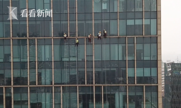 220米高空,陆家嘴双辉大厦的顶层。5位“蜘蛛人”绑好安全装备,又检查了一遍要携带的灯具,开始小心地使用绳索降下。
