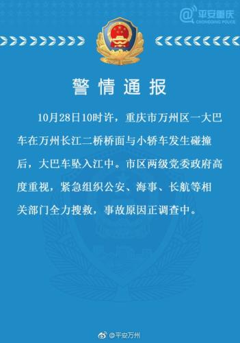 中新网重庆10月28日电 (记者 刘相琳 韩璐 钟旖)重庆市公安局万州区分局28日通报称,当日10时许,重庆市万州区一大巴车在万州长江二桥桥面与小轿车发生碰撞后,大巴车坠入江中。