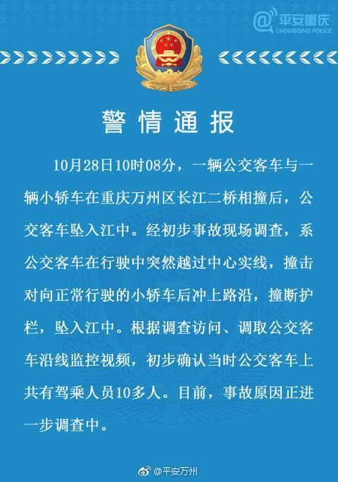 据微博“平安万州”最新消息,重庆万州公交车坠江事故经初步确认,事故发生时,公交车上共有驾乘人员10多人。