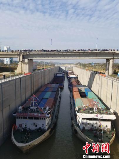 图为,船舶通行湖南株洲航电枢纽二线船闸 卢盛雄 摄