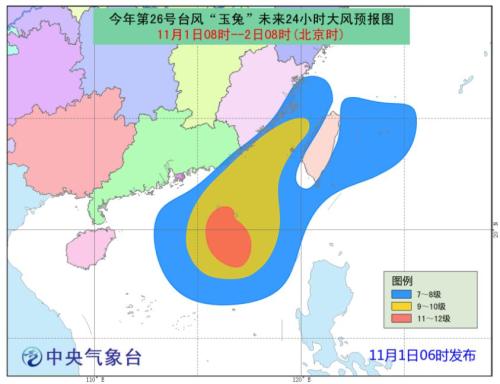受“玉兔”和冷空气共同影响,11月 1日08时到11月2日08时,广东东部、福建中南部沿海、台湾东部和南部等地将有大雨,局地有暴雨或大暴雨(50~110毫米)。东海南部偏南海域、台湾以东洋面、巴士海峡、南海中东部偏北海域和南海西北部偏东海域及台湾沿海将有7~8级大风,阵风9~10级;台湾海峡、福建沿海、广东东部沿海、南海东北部大部海域风力达9~10级,阵风11~12级;“玉兔”中心经过的南海东北部的部分海域或地区的风力可达11~12级,阵风13~14级(见图2)。