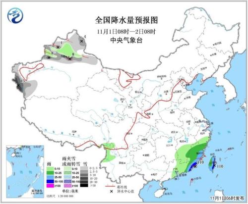 11月1日08时至2日08时,新疆北部和南疆西部山区等地部分地区有中到大雪或雨夹雪,局地有暴雪(10~15毫米)。江南东部、广东中东部和台湾岛东北部等地的部分地区有中到大雨,其中,广东东部、福建南部和台湾等地局地有暴雨或大暴雨(100~110毫米)。新疆北部、南疆盆地、内蒙古西部和甘肃西部等地的部分地区有5~6级及以上风。台湾海峡、南海东北部海域将有8~9级大风,阵风10~11级(见图3)。