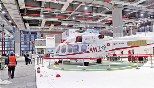 十月三十日,意大利莱奥纳多直升机公司的一架AW189直升机在展台上就位。当日,首届中国国际进口博览会展馆搭建工作在国家会展中心(上海)的全部八个展馆内火热进行。 新华社记者 方 喆摄