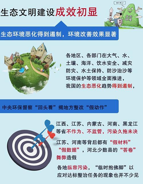 一方面,针对目前存在的生态文明制度体系建设不完善、建设资金投入不足、人才队伍缺乏等问题,山西省先后出台多项政策推进生态修复、绿色消费、防止污染等方面工作,重庆发布绿色金融规划等。在网民眼中,一年来各地环保领域新政频出,“风暴”刮出了效果,“蓝天白云”重现,生态优美的“绿水青山”渐渐形成。另一方面,中央环保督察对河北等10省环保“回头看”,也揭开了部分地方“另辟蹊径”的整改“假动作”和“新花样”,以铁腕手段治污整改,打破了环保违法“保护伞”。