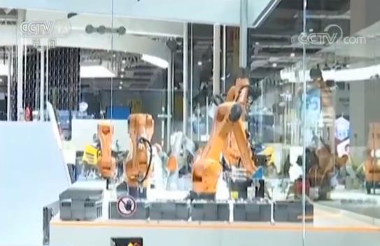 记者:“在现场,这家来自德国的企业搭建了一个小型的智能工厂。在这个装配台上,机械手臂将联合作业,向观众展示机器人生产的灵活、高效和精密。”