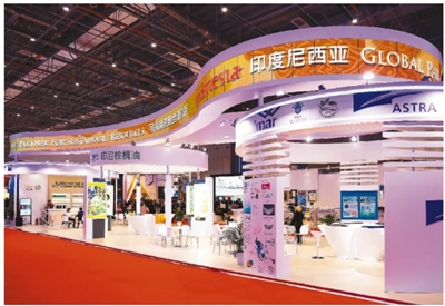 11月5日,中国国际进口博览会在上海开幕。国家贸易投资综合展(国家展)是中国国际进口博览会的重要内容,共有82个国家、3个国际组织设立71个展台。国家展中,印度尼西亚、越南、巴基斯坦、南非、埃及、俄罗斯、英国、匈牙利、德国、加拿大、巴西、墨西哥等12个主宾国均设立了独具特色的展馆。图为11月5日拍摄的印度尼西亚展馆。新华社记者 刘大伟摄