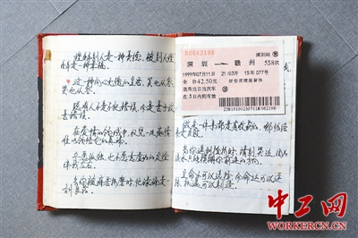 劳务工博物馆内陈列的笔记本,留存着务工者当年的“心灵鸡汤”和火车票。