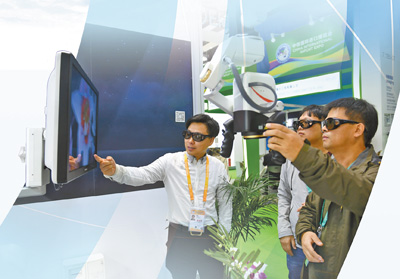 医疗器械及医药保健展区,一位观众正在体验术中鹰眼放大系统。本报记者 陈 斌摄