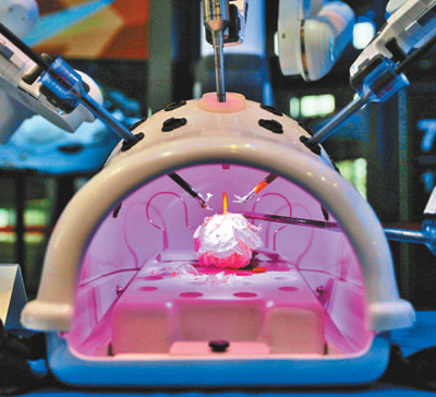 在进博会7.1馆,复星正在展示神奇的达芬奇手术机器人,在不触碰其他花蕊的情况下,它可以将一根细小的花蕊轻松剪断,目前它在中国已经成功完成10万例手术。中国经济周刊记者 肖 翊摄