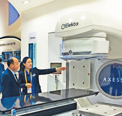 医科达工作人员向观展商介绍新一代肿瘤放射治疗的智能数字化平台Elekta Axesse。本报记者 黄 超摄