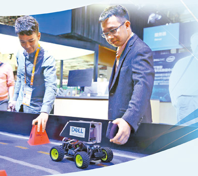 戴尔公司展台工作人员正在展示应用人工智能的无人驾驶技术。自动驾驶已经成为汽车工业的未来发展方向,戴尔通过开发集成了车辆动力学、传感器、执行器和交通环境模型在内的模拟回路,提升了自动驾驶的效率和安全性能。本报记者 白之羽摄
