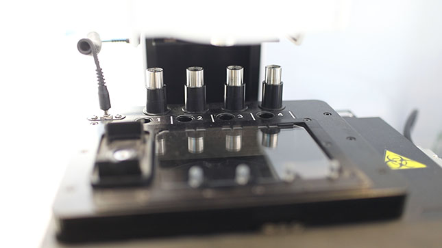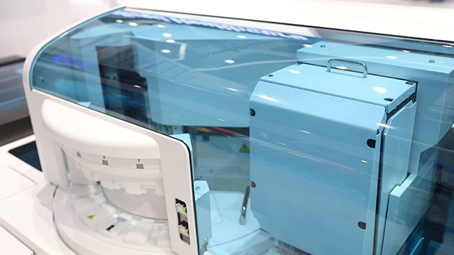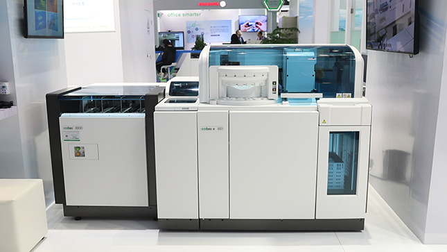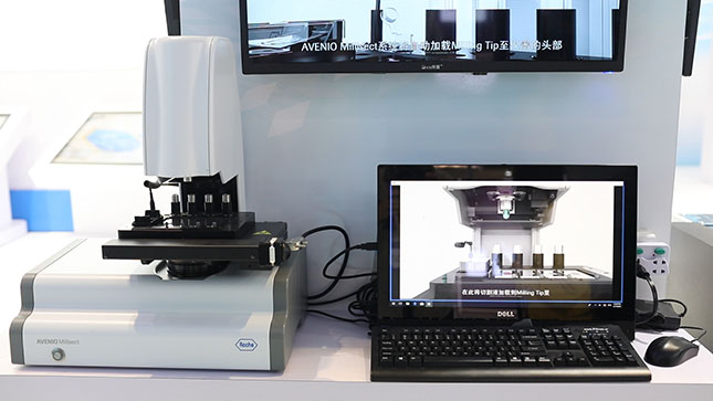 在进博会医疗器械及医药保健展区,罗氏诊断展出了一系列高端体外诊断设备,其体外诊断技术可提供创新、高效的诊断解决方案,贯穿整个全生命周期,为肿瘤、心脏、代谢疾病、传染性疾病、炎症、自身免疫病等疾病领域诊疗提供重要医学信息。比如罗氏今年刚刚在中国上市的cobas e 801全自动化学发光免疫分析仪,一管血就可以进行90个项目的检测,检测精准度和速度都处于行业领先水平。一旁的AVENIO Millisect System全自动组织切割系统,则可以从人体组织切片中精确取出微米级的肿瘤细胞,代替传统手工切割等做法,更精细准确。