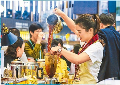进博会食品及农产品展区上,参展人员制作“金茶王”港式奶茶。新华社记者 殷 刚摄