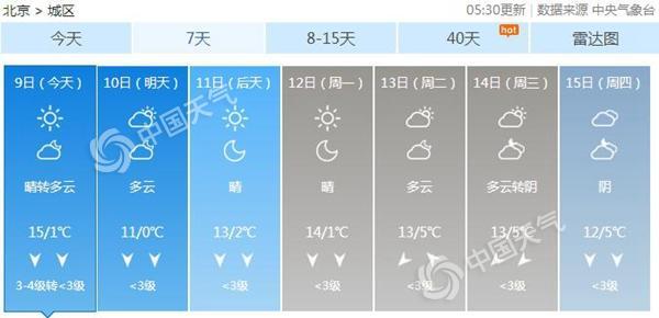 北京市气象台9日6时发布预报:今天白天晴间多云,北风4级左右(阵风6、7级)转2、3级,最高气温15℃;夜间晴转多云,北风2、3级,最低气温1℃。