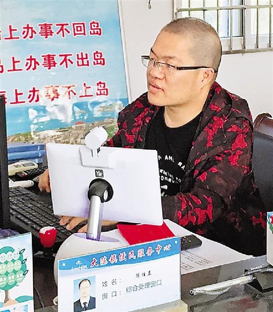 33岁的陈佳益是大陈镇便民服务中心为数不多的综合窗口办事员之一。利用各种互联网移动端为岛上居民办事已成为他的日常工作。