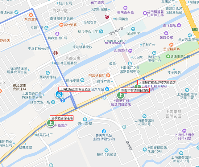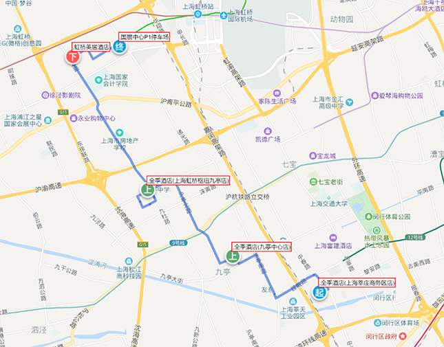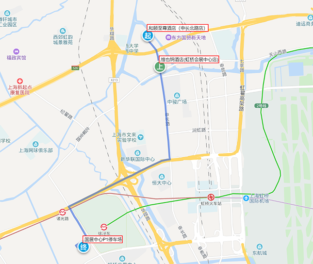 3、徐泾线:上海虹桥西郊假日酒店—全季酒店徐泾店—新虹桥智选假日酒店—上海新虹桥希尔顿花园酒店—国家会展中心