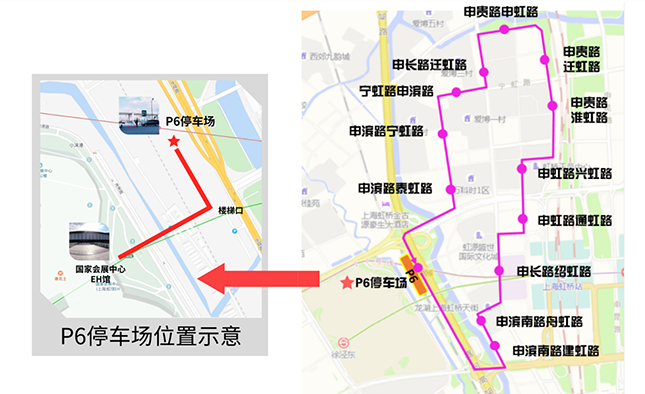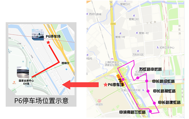 进馆路线:申虹路舟虹路站(步行)——申滨南路舟虹路站(乘坐“虹桥商务区停车场接驳线北区”)——P6停车场(步行)——国家会展中心(EH馆)