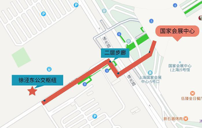 进馆路线:徐泾东公交枢纽——徐民路——徐民东路诸光路路口——二层步廊——国展中心WH馆