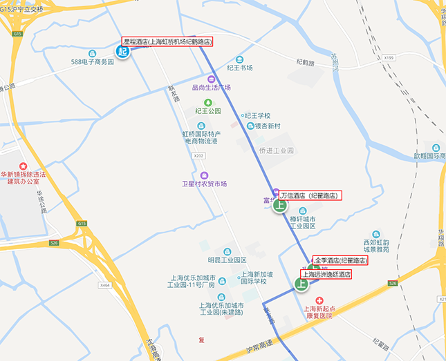 2、诸翟线:星程酒店(上海虹桥机场纪鹤路店)—万信酒店(纪翟路店)—全季酒店(纪翟路店)—上海远洲逸廷酒店—国家会展中心