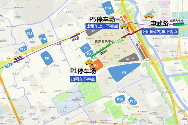 国家会展中心周边共设3个出租车上、下客点,分别为P1停车场(出租车下客点)、申武路(出租车下客点、网约车下客点)、P5停车场(出租车上客点、下客点)。