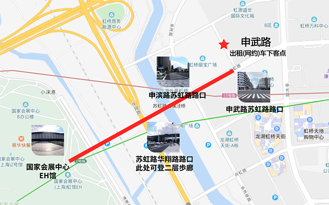 建议路线:从申武路出租车(网约)车下客点出发,沿苏虹路向西步行,在苏虹路华翔路路口登上二层歩廊,沿二层歩廊继续向西步行,最终到达国家会展中心EH馆。